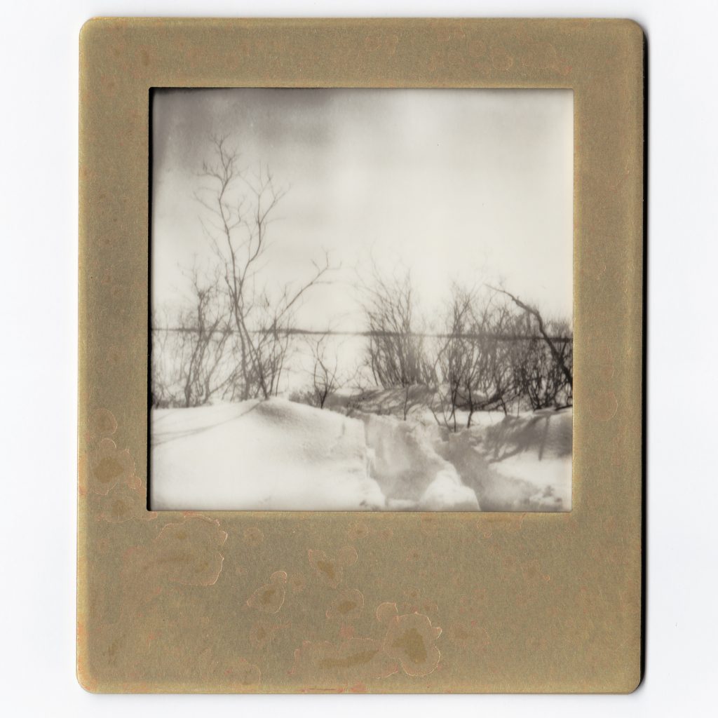 « Astray – lac » (triptyque), photographies argentiques polaroid et cadres de laiton oxydés, 2025.